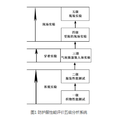 防化服的性能評價主要包含防護性能以及舒適性2個方面。目前成熟的評價體系是五級分析系統(tǒng),如圖1所示??梢詣澐譃榭陀^評價、人體穿著實驗以及現(xiàn)場實驗3個層次。