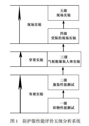 防化服的性能評價主要包含防護(hù)性能以及舒適性2個方面。 目前成熟的評價體系是五級分析系統(tǒng),如圖1所示。 可以劃分為客觀評價、人體穿著實驗以及現(xiàn)場實驗3個層次。
