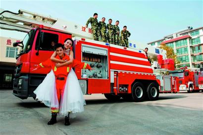 身著消防服和穿著潔白婚紗的一對新人以登高車、訓練塔、搜救犬等為背景,那些曾經(jīng)號稱時尚、古典、樸素、奢華的最美婚紗照們,在這一刻被徹底的秒殺了,就是依靠這些簡單元素使一對新人一下子“火”了。