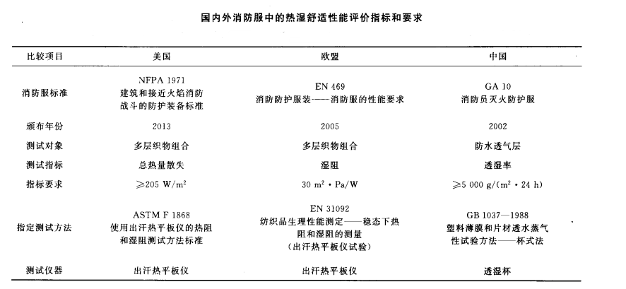 消防服相關(guān)標(biāo)準(zhǔn)對(duì)熱濕舒適性的要求