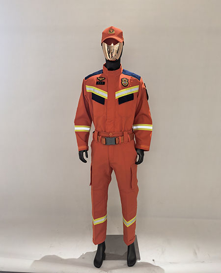 ●防護服面料分為外層、防水透氣層、隔熱層、舒適層。外層面料選用PMIA三合一芳綸布、收縮性小,易于洗滌并具有阻燃性(續(xù)燃時間0秒,毀損長度為44mm,無熔融、滴落現(xiàn)象)、熱穩(wěn)定性???jié)竦燃墳?級,色牢度為4極。